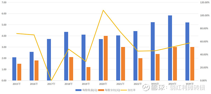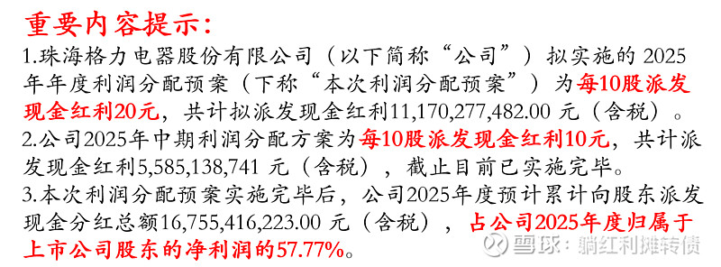 从数据来看,格力年报分红预案公布的每股分红为2.00元,算上每股1.00元的中期分红,全年每股分红合计3.00元,以2025年5.20元的每股收益计算本次分红分派率达到了57.77%,过去三年,格力的分红率从2023年的45%稳步提升到如今的58%,分红的力度逐年增强,以公告发布日收盘后每股38.44元的价格计算2025年的分红收益率为7.80%。
