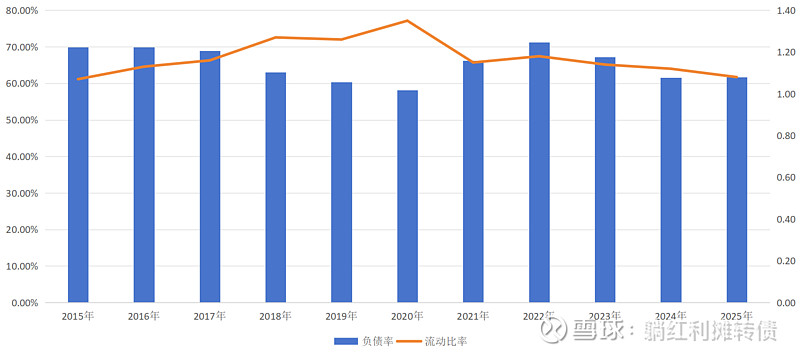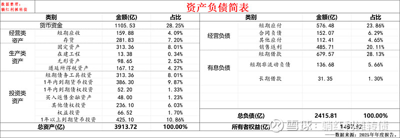 从资产负债的情况来看,近些年负债率温和下降,但是整体负债率还是超过了60%,流动比率也不算高,过去十年基本在1倍到1.4倍间波动,单从账面数据看资产负债情况是比较弱的,不过实际上格力的负债压力并没有想象中那么大,下面是格力2025年年报资产负债表的简要构成信息: