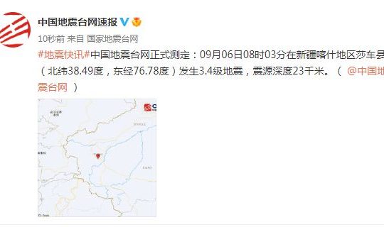 新疆喀什地区莎车县发生3.4级地震,震源深度23千米